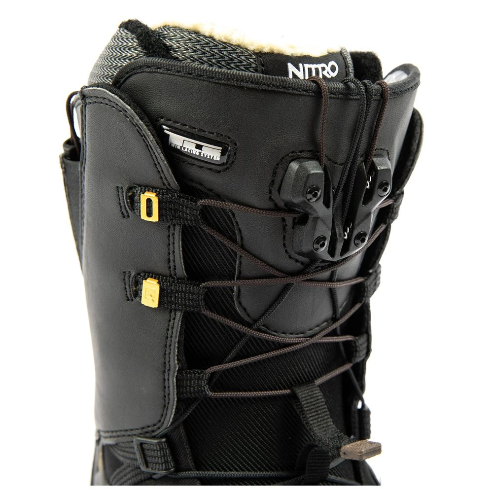 Les Nitro Faint TLS sont des boots de snowboard pour femme avec un flex assez ferme, évalué à 7/10 (10 étant le plus rigide). Elles se destinent donc à une pratique engagée, que cela soit pour du freestyle de haute voltige, du ride polyvalent dans toute la station ou pour rider fort en freeride. Pour vous permettre de passer d’encore meilleures sessions, elle est dotée d’une semelle extérieure Vibram robuste et offrant une bonne adhérence lors des phases de marche, d’un insert D3O Shock Absorption et d’un amorti AIR pour encaisser les chocs, d’une semelle Ortholite double densité, ainsi que d’un chausson très haut de gamme, le Women’s Cloud 9, avec membrane Therminator Shield pour vous protéger du froid. Une chaussure vraiment suréquipée qui fera le bonheur des snowboardeuses confirmées/expertes qui veulent engager tout en gardant un maximum de confort.